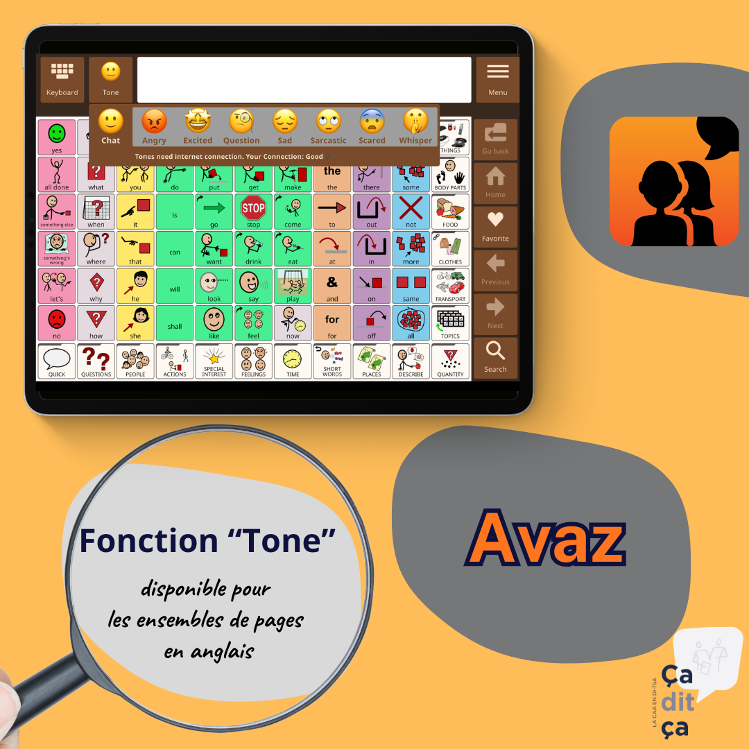 Un point fort des derniers développements de l’application Avaz est la fonction “Tone” qui apporte une intonation différente aux messages produits par l’utilisatrice ou l’utilisateur. Le même message peut être prononcé sur un ton fâché, excité, heureux, triste ou même encore murmuré, lorsque l’on clique sur l’émoticon correspondant. En revanche, deux gros bémols : cette fonctionnalité n’est disponible que pour les versions anglophones des ensembles de pages (donc on ne l’a pas en français) et elle n’est possible que si l’appareil est connecté à Internet.