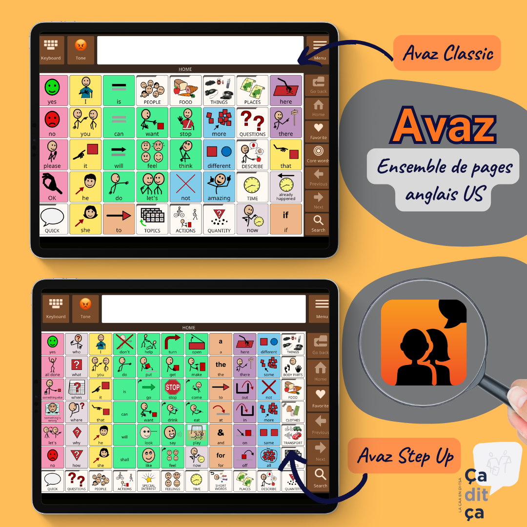 L’application propose deux niveaux de vocabulaire, en fonction de la taille de grille choisie. Pour des tableaux contenant 40 symboles et moins, il est suggéré de choisir le niveau “Avaz Classic”, et pour des tableaux de 60 à 117 messages, le niveau “Step Up” (bâti en collaboration avec Lauren Enders Gonzales, orthophoniste, et Kate Ahern, enseignante en adaptation scolaire, toutes deux renommées en CAA, aux États-Unis) est plutôt recommandé. Malheureusement, aucun des ensembles de pages dans les autres langues ne donne accès à ces possibilités.