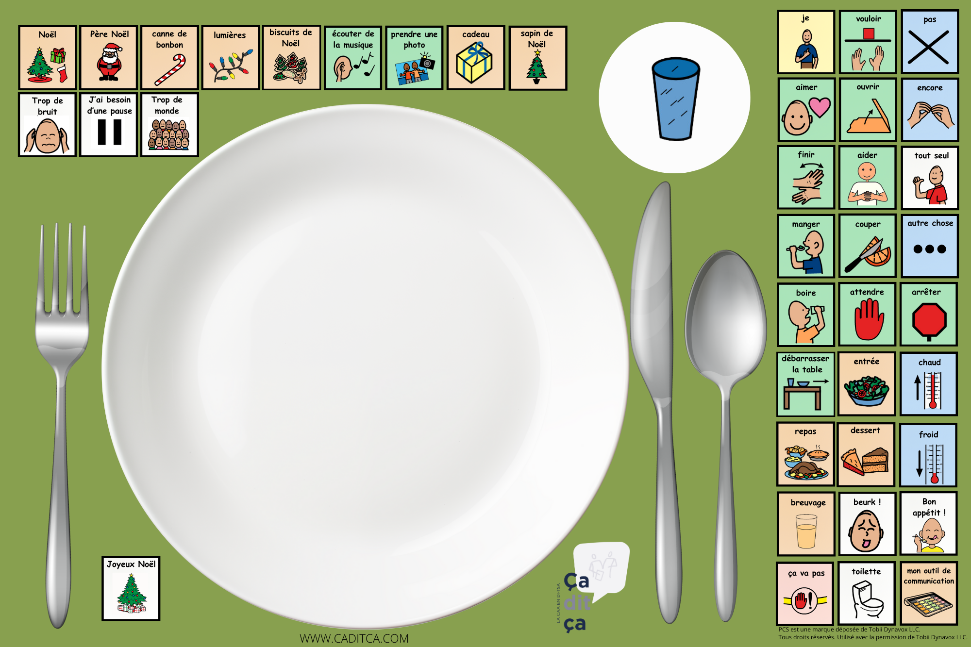 Ce napperon a été pensé pour permettre de faciliter les échanges lors des repas des fêtes. Il inclut plusieurs mots et pictogrammes festifs pour aider à exprimer des besoins, des émotions, et des souhaits.