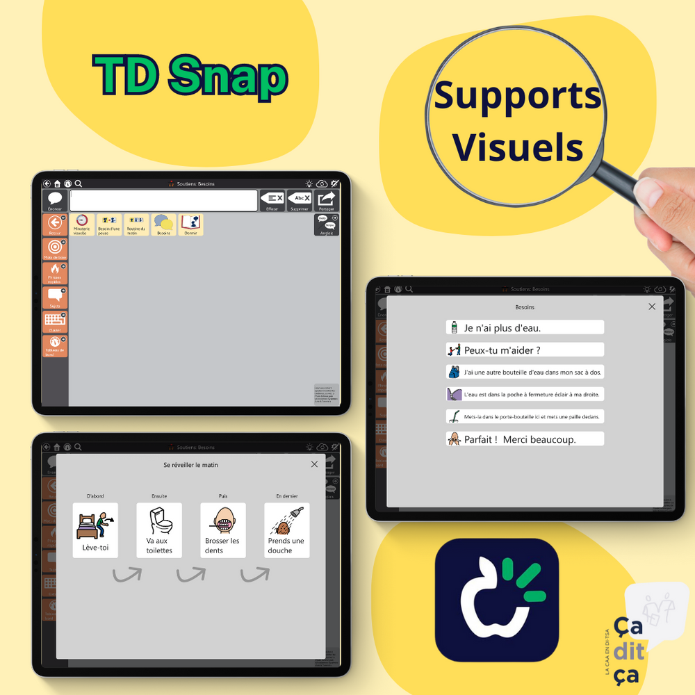 L’application offre aussi la possibilité de bâtir des outils visuels intégrés à l’ensemble de pages de l’utilisateur, pour soutenir sa compréhension et diminuer l’anxiété et la survenue de comportements défis. On y trouve notamment des gabarits pour construire des séquences, des visuels “maintenant-après”, des routines et des scripts pour différentes situations, entre autres.