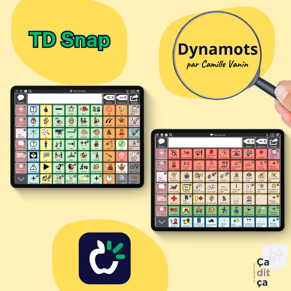 Dynamots, créé par Camille Vanin, orthophoniste, est un autre ensemble de pages qu’on apprécie notamment pour la multitude de liens qui existent entre les pages, ce qui facilite la navigation de l’utilisateur pour exprimer un message. Il est disponible dans un format de grille de 8 x 10 cases.