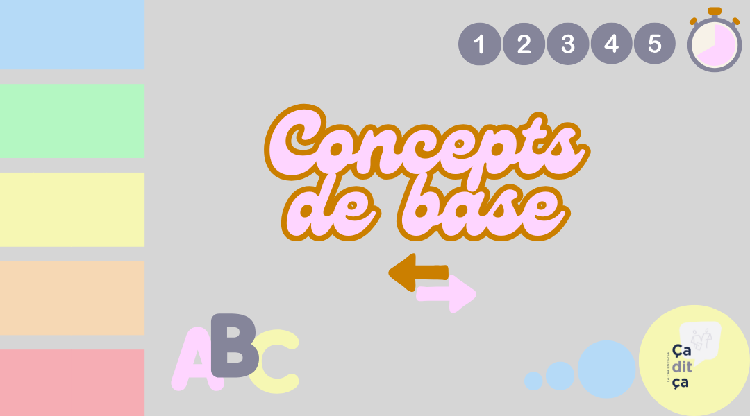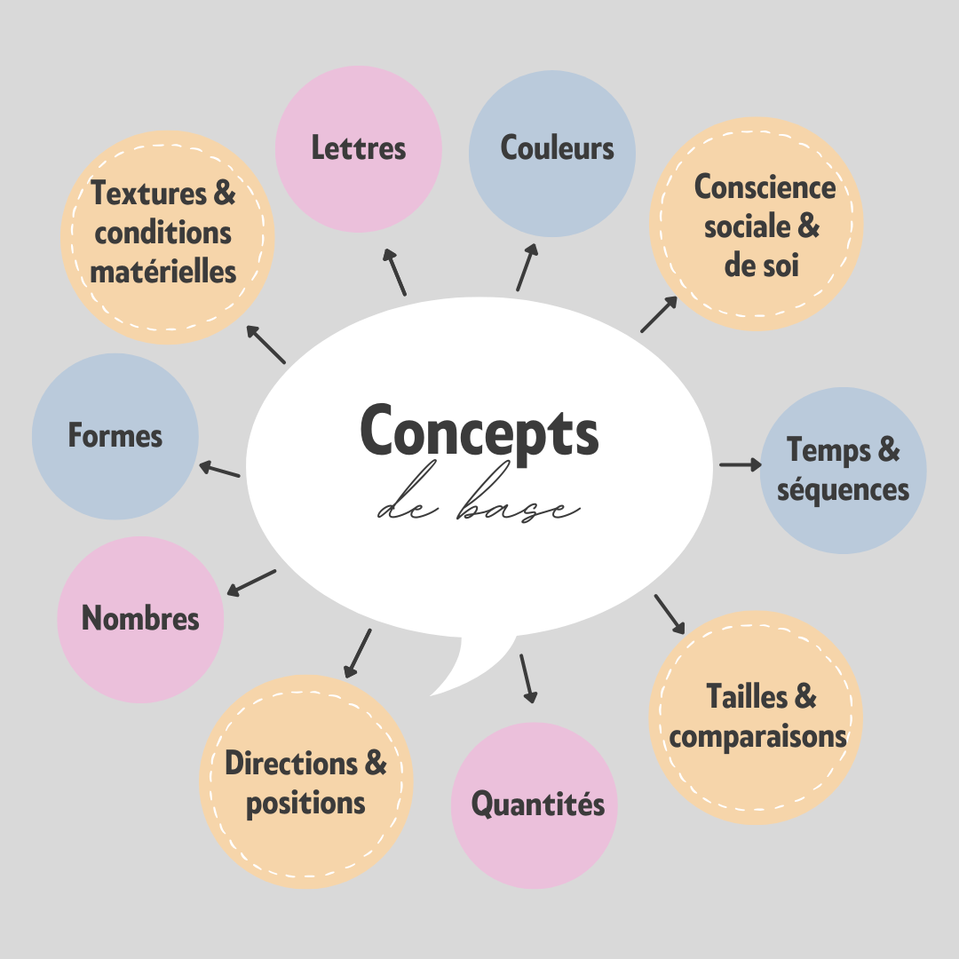Aujourd’hui, et tout au long de cette thématique, nous aborderons également l’importance de développer les concepts de base. Il s'agit d’un ensemble de mots qui permettent de décrire le monde, les objets, les situations et les relations entre les personnes. On y trouve notamment les couleurs, les nombres, les lettres, formes, les notions de temps et d’espace, etc.