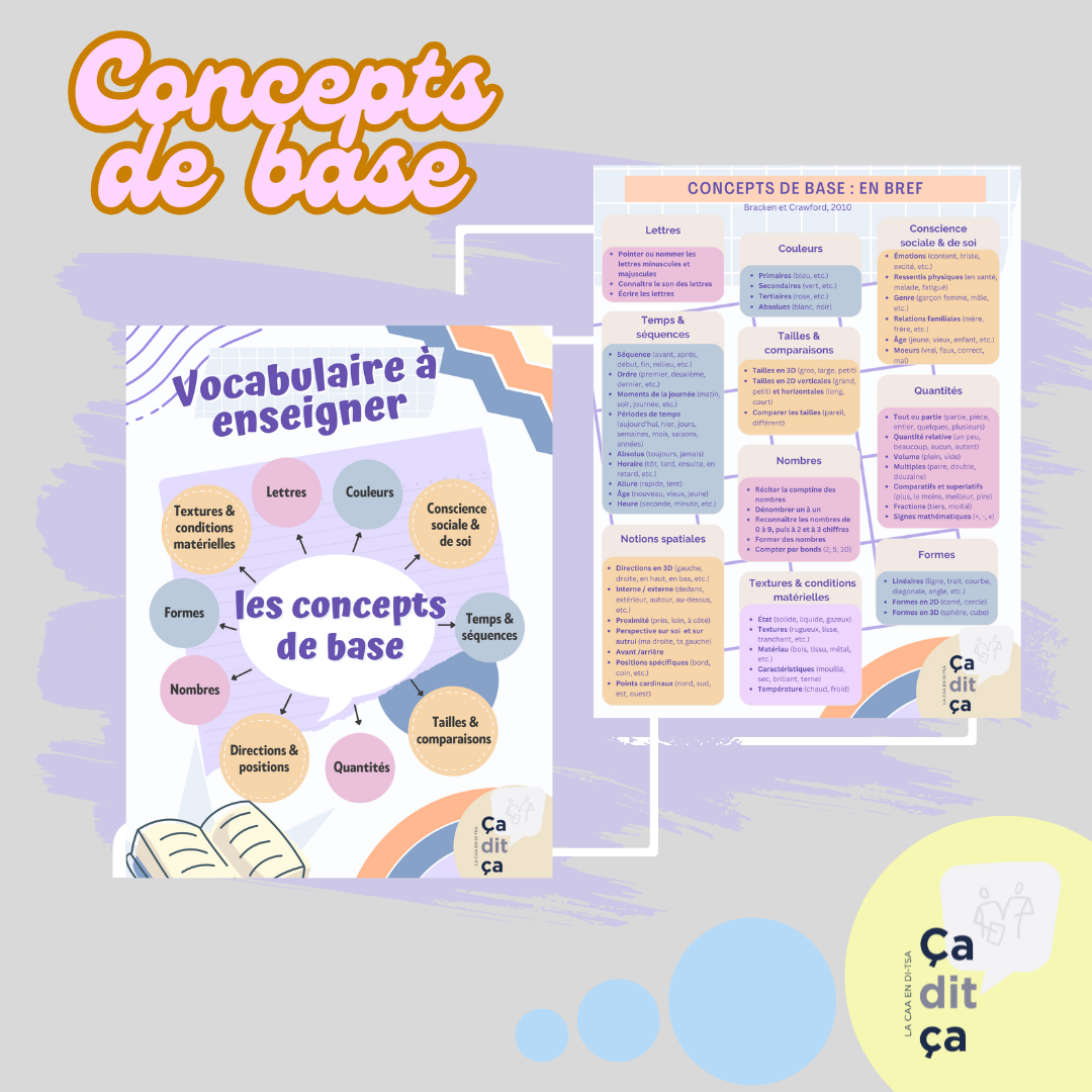 Bracken et Crawford ont dressé une liste de concepts de base, classés par catégories, dans un article publié en 2010. Nous avons traduit cette liste et nous vous la partageons aujourd’hui, en espérant que cet aide-mémoire vous sera utile, pour stimuler ce vocabulaire précieux !