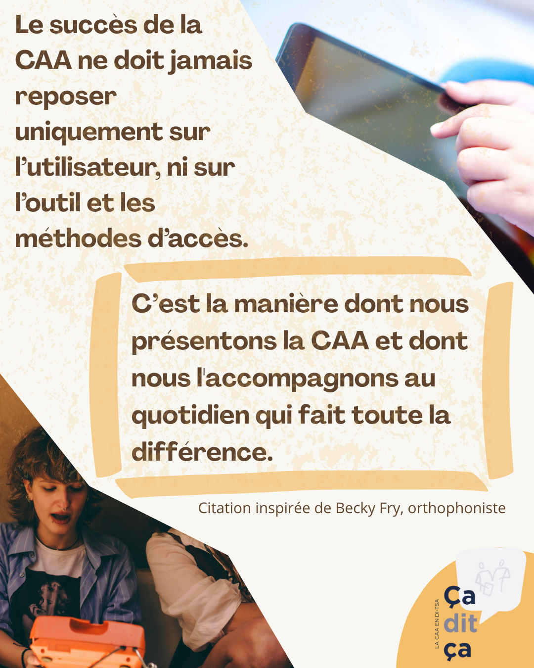 Dans son article, Becky Fry insiste sur les points suivants : “Le succès de la CAA ne doit jamais reposer uniquement sur l’utilisateur, ni sur l’outil et les méthodes d’accès. C’est la manière dont nous présentons la CAA et dont nous l'accompagnons au quotidien qui fait toute la différence.”