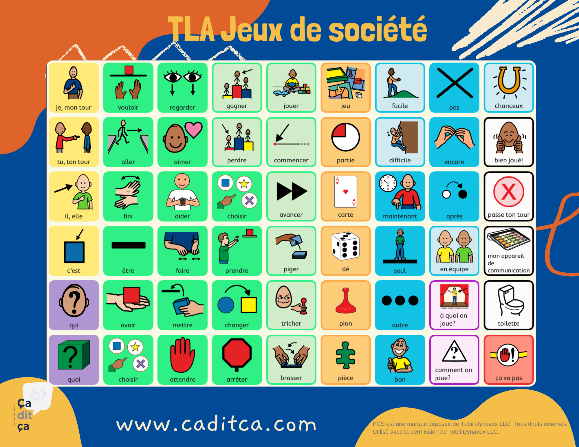 Vous pourrez utiliser ce tableau pour échanger durant une grande variété de jeux, grâce à des mots que l’on emploie fréquemment durant une partie. N’hésitez pas à utiliser l’outil complet de CAA pour accéder à encore plus de vocabulaire spécifique !