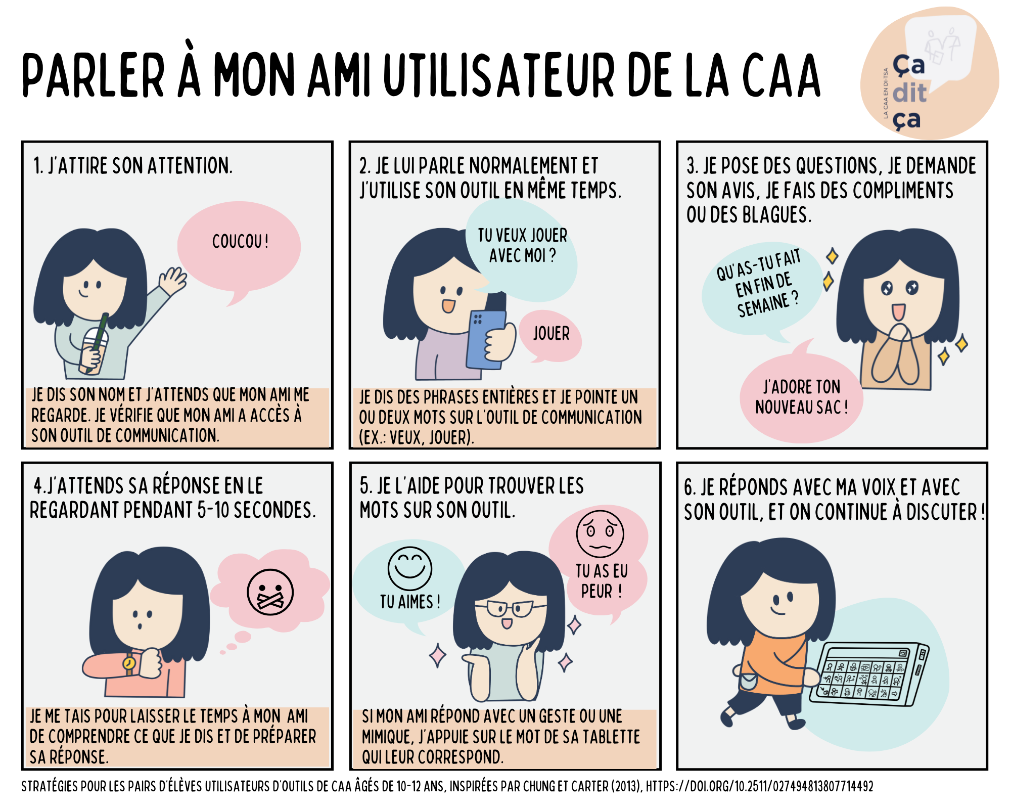 Les stratégies présentées sont en partie inspirées d'un article de Chung et Carter (2013), dans lequel les chercheurs ont enseigné à des élèves de 10 à 12 ans des stratégies pour favoriser les interactions avec leurs pairs autistes, utilisatrices et utilisateurs de la CAA, en classe inclusive.