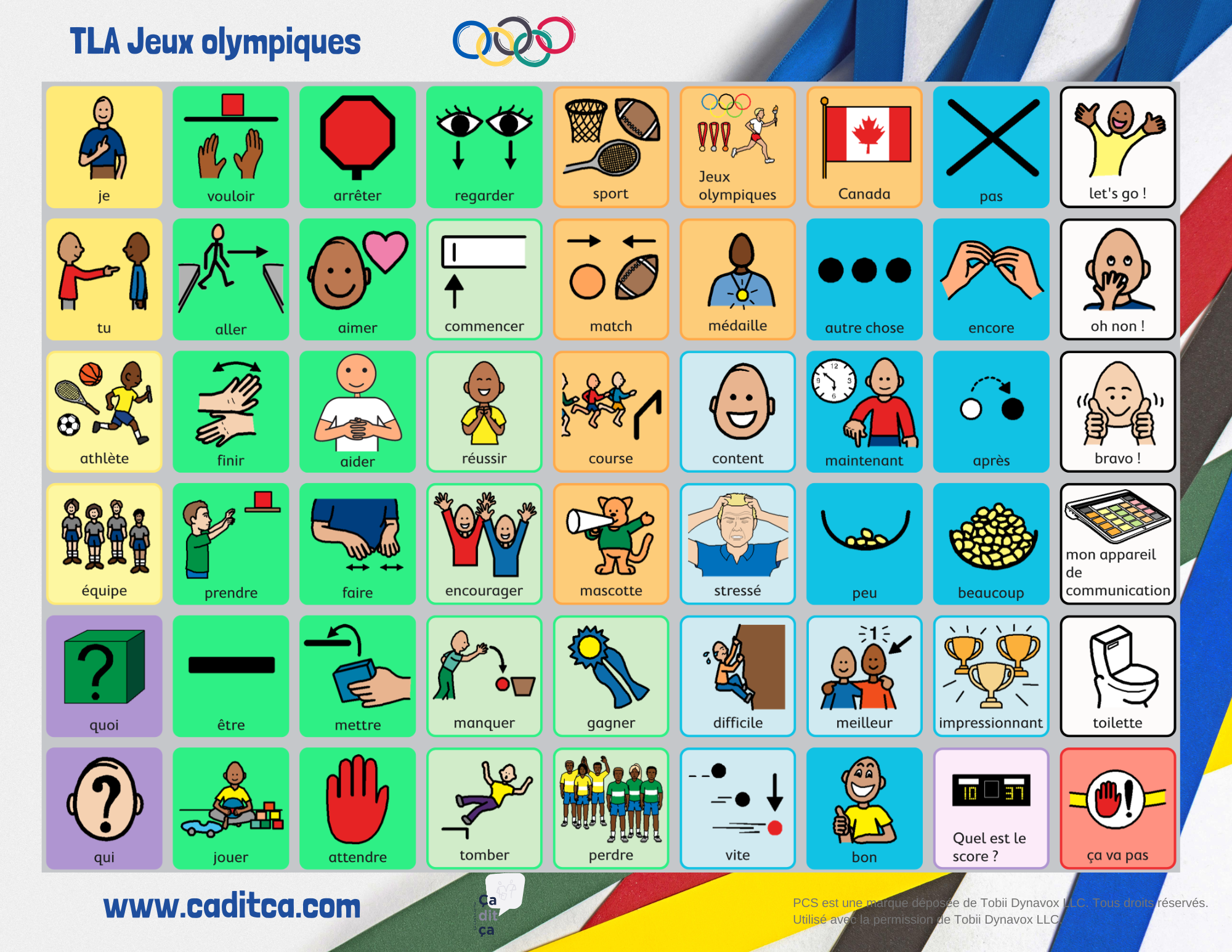 Comme un tableau de communication demeure un outil limité en nombre de cases et ne remplace pas un système plus robuste, si vous souhaitez parler des mascottes des Olympiques, de votre athlète préféré, d’un sport en particulier ou de tout autre élément plus spécifique, nous vous conseillons d’utiliser les mots clés déjà présents dans le tableau pour amorcer le sujet, puis de compléter votre message à l’aide d’un support supplémentaire (pictogrammes additionnels, photos, gestes ou clavier, selon les capacités de la personne utilisatrice de la CAA).