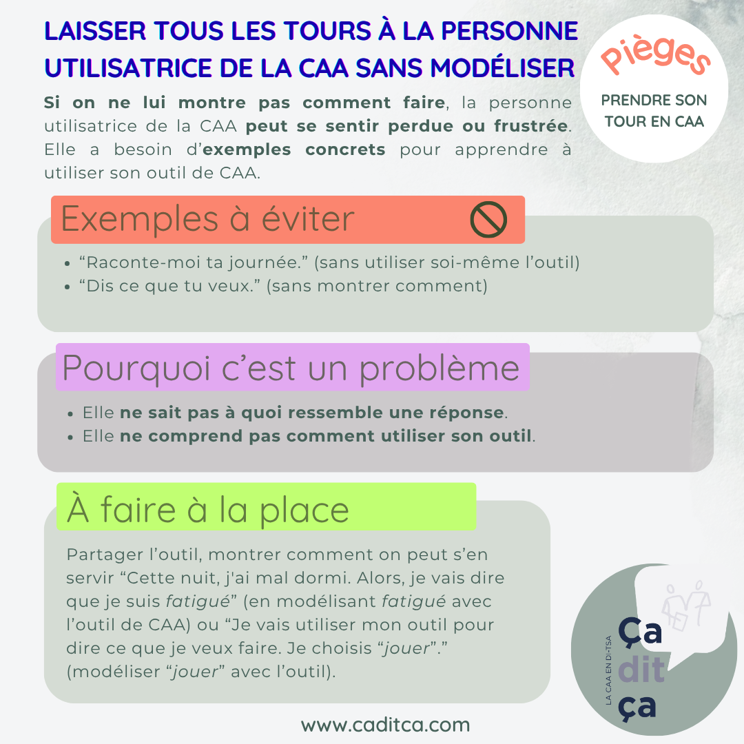 Cette publication s’inspire de la vidéo "Take-a-turn" de Carole Zangari, réalisée dans le cadre du projet Stepping into AAC. Elle s’inscrit dans notre série dédiée à la modélisation en Communication Améliorée et Alternative (CAA). Le thème du tour de rôle nous a particulièrement interpellées puisqu’il n'est pas souvent abordé en CAA. Ce principe est directement lié à la façon dont on modélise en CAA. Le juste équilibre se trouve dans une alternance fluide : modéliser pour montrer, puis laisser de la place à l’utilisateur pour s’exprimer, même si cela prend du temps.
